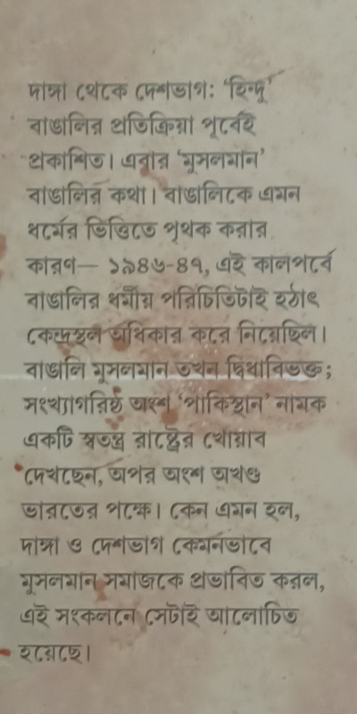 দাঙ্গা থেকে দেশভাগ: 'হিন্দু' বাঙালির প্রতিক্রিয়া পূর্বেই প্রকাশিত। এবার 'মুসলমান' বাঙালির কথা। বাঙালিকে এমন ধর্মের ভিত্তিতে পৃথক করার কারণ- ১৯৪৬-৪৭, এই কালপর্বে বাঙালির ধর্মীয় পরিচিতিটাই হঠাৎ কেন্দ্রস্থল অধিকার করে নিয়েছিল। বাঙালি মুসলমান তখন দ্বিধাবিভক্ত; সংখ্যাগরিষ্ঠ অংশ 'পাকিস্থান' নামক একটি স্বতন্ত্র রাষ্ট্রের খোয়াব "দেখছেন, অপর অংশ অখণ্ড ভারতের পক্ষে। কেন এমন হল, দাঙ্গা ও দেশভাগ কেমনভাবে মুসলমান সমাজকে প্রভাবিত করল, এই সংকলনে সেটাই আলোচিত - হয়েছে।