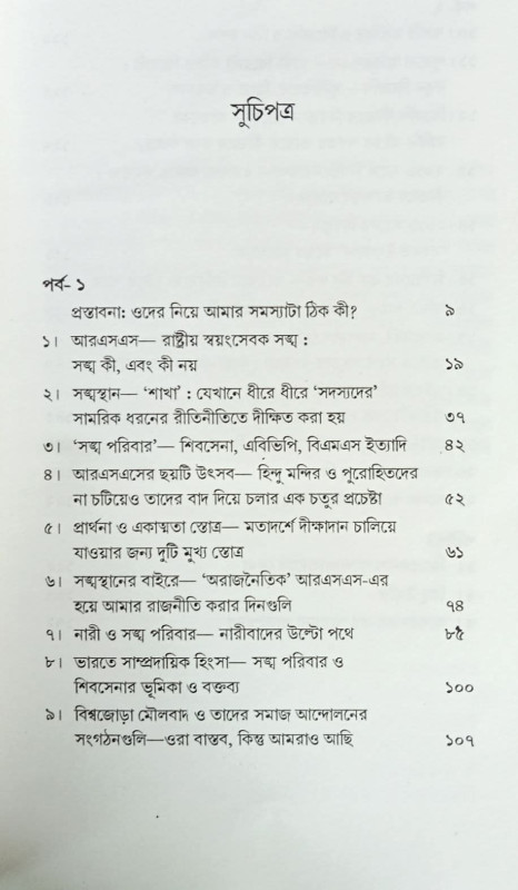 বইটিতে আছে সংঘের বিশ্লেষণ এবং তার ধ্বংসাত্মক ও হিংসাত্মক রাজনীতির সমালোচনা। যে রাজনীতির জন্য বহু চিন্তা করে অবশেষে লেখক তার একদা-প্রিয় সংঘের সঙ্গে নাড়ির টান ছিঁড়তে বাধ্য হয়েছিলেন। একজন উদারপন্থী ভারতীয় ও বাঙালি হিসেবে, একজন রবীন্দ্র অনুরাগী হিসাবে, তার পক্ষে অন্য কিছু করা সম্ভব ছিল না। বইটিতে আমরা আরও পাই সংঘের কার্যাবলীর বিশদ আলোচনা, যা অন্য ধরনের আলোচনায় বিরল। লেখক সংঘের বিপজ্জনক রাজনীতির শক্তির উৎস কোথায়, তার সন্ধান করেছেন।