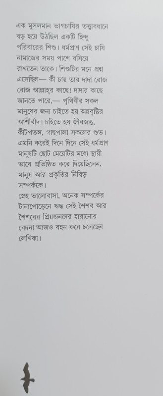 এক মুসলমান ভাগচাষির তত্ত্বাবধানে বড় হয়ে উঠছিল একটি হিন্দু পরিবারের শিশু। ধর্মপ্রাণ সেই চাষি নামাজের সময় পাশে বসিয়ে রাখতেন তাকে। শিশুটির মনে প্রশ্ন এসেছিল- কী চায় তার দাদা রোজ রোজ আল্লাহর কাছে। দাদার কাছে জানতে পারে, পৃথিবীর সকল মানুষের জন্য চাইতে হয় অন্নবৃষ্টির আশীর্বাদ। চাইতে হয় জীবজন্তু, কীটপতঙ্গ, গাছপালা সকলের শুভ। এমনি করেই দিনে দিনে সেই ধর্মপ্রাণ মানুষটি ছোট মেয়েটির মধ্যে স্থায়ী ভাবে প্রতিষ্ঠিত করে দিয়েছিলেন, মানুষ আর প্রকৃতির নিবিড় সম্পর্ককে।