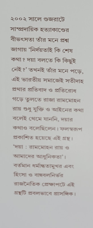 ২০০২ সালে গুজরাটে সাম্প্রদায়িক হত্যাকাণ্ডের বীভৎসতা তাঁর মনে প্রশ্ন জাগায় 'নির্দয়তাই কি শেষ কথা? দয়া বলতে কি কিছুই নেই?' তখনই তাঁর মনে পড়ে, এই ভারতীয় সমাজেই সতীদাহ প্রথার প্রতিবাদ ও প্রতিরোধ গড়ে তুলতে রাজা রামমোহন রায় শুধু যুক্তি ও আইনের কথা বলেই থেমে যাননি, দয়ার কথাও বলেছিলেন। ফলস্বরূপ প্রকাশিত হয়েছে এই গ্রন্থ। 'দয়া: রামমোহন রায় ও আমাদের আধুনিকতা'। বর্তমান ধর্মান্ধতামুখর এবং হিংসা ও বাহুবলনির্ভর রাজনৈতিক প্রেক্ষাপটে এই গ্রন্থটি প্রবলভাবে প্রাসঙ্গিক।