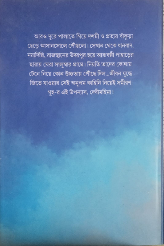 আরও দূরে পালাতে গিয়ে দশমী ও প্রত্যয় বাঁকুড়া ছেড়ে আসানসোলে পৌঁছলো। সেখান থেকে ধানবাদ, নয়াদিল্লি, রাজস্থানের উদয়পুর হয়ে আরাবল্লী পাহাড়ের ছায়ায় ঘেরা সালুম্বার গ্রামে। নিয়তি তাদের কোথায় টেনে নিয়ে কোন উচ্চতায় পৌঁছে দিল... জীবন যুদ্ধে জিতে যাওয়ার সেই অনুপম কাহিনি নিয়েই সমীরণ গুহ-র এই উপন্যাস, দেবীমহিমা!