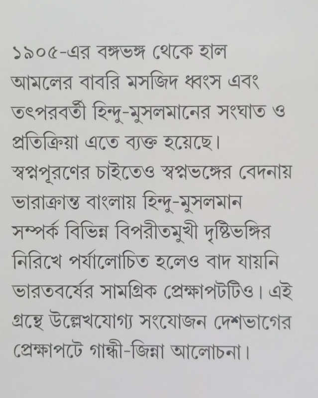 স্বপ্নপূরণের চাইতেও স্বপ্নভঙ্গের বেদনায় ভারাক্রান্ত বাংলায় হিন্দু-মুসলমান সম্পর্ক বিভিন্ন বিপরীতমুখী দৃষ্টিভঙ্গির নিরিখে পর্যালোচিত হলেও বাদ যায়নি ভারতবর্ষের সামগ্রিক প্রেক্ষাপটটিও। এই গ্রন্থে উল্লেখযোগ্য সংযোজন দেশভাগের প্রেক্ষাপটে গান্ধী-জিন্না আলোচনা।