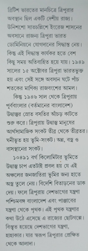 কিন্তু ১৯৪৬ সাল থেকে ত্রিপুরায় পূর্ববাংলার (বর্তমানের বাংলাদেশ) উদ্বাস্তুর স্রোত বসতির আঁচড় কাটতে শুরু করে। ত্রিপুরায় উদ্বাস্তু মানুষের আর্থসামাজিক সংকট তীব্র থেকে তীব্রতর। ঘনীভূত হয় ভূমি-সংকট। অন্ন, বস্ত্র ও বাসস্থানের সংকট।