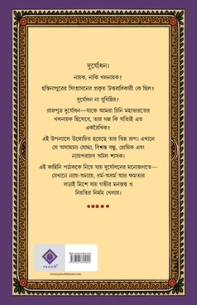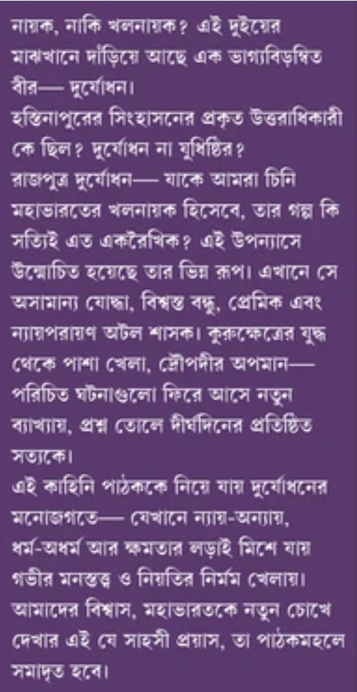 এই কাহিনি পাঠককে নিয়ে যায় দুর্যোধনের মনোজগতে- যেখানে ন্যায়-অন্যায়, ধর্ম-অধর্ম আর ক্ষমতার লড়াই মিশে যায় গভীর মনস্তত্ব ও নিয়তির নির্মম খেলায়। আমাদের বিশ্বাস, মহাভারতকে নতুন চোখে দেখার এই যে সাহসী প্রয়াস, তা পাঠকমহলে সমাদৃত হবে।