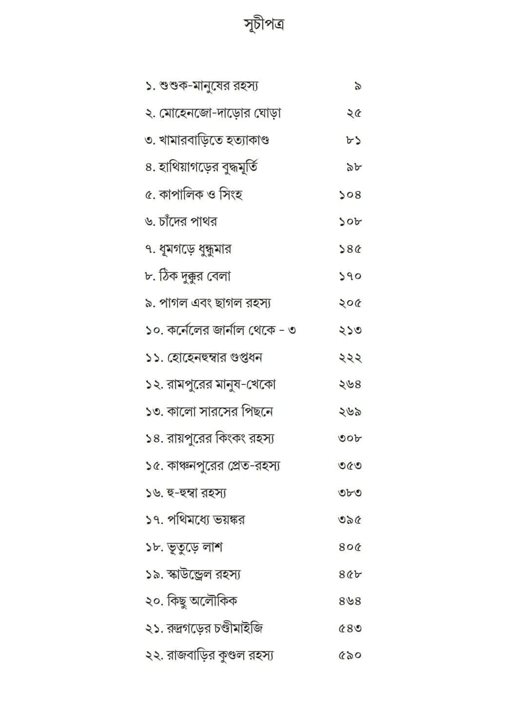 শুশুক-মানুষের রহস্য, মহেঞ্জো-দাড়োর ঘোড়া, খামারবাড়িতে হত্যাকাণ্ড, হাথিয়াগড়ের বুদ্ধমূর্তি, কাপালিক ও সিংহ, চাঁদের পাথর, ধূমগড়ে ধুন্ধুমার, ঠিক দুক্কুর বেলা, পাগল এবং ছাগল রহস্য, কর্নেলের জার্নাল থেকে - ৩, হোহেনহুম্বার গুপ্তধন, রামপুরের মানুষ-খেকো, কালো সারসের পিছনে, রায়পুরের কিংকং রহস্য, কাঞ্চনপুরের প্রেত-রহস্য, হু-হুম্বা রহস্য, পথিমধ্যে ভয়ঙ্কর, ভূতুড়ে লাশ, স্কাউড্রেল রহস্য, কিছু অলৌকিক, রুদ্রগড়ের চণ্ডীমাইজি, রাজবাড়ির কুণ্ডল রহস্য