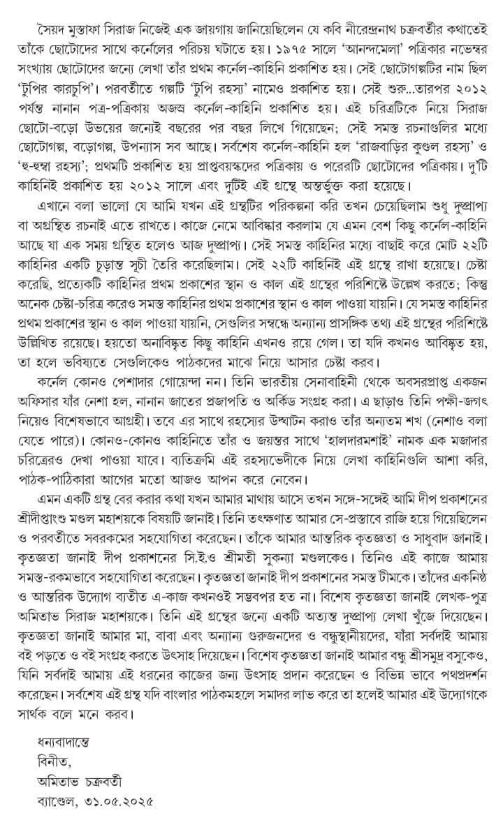 • বাইশটি কর্নেল-কাহিনি, যার মধ্যে অধিকাংশই এ-যাবৎ অগ্রন্থিত। এদের মধ্যে এমন কিছু কাহিনি থাকছে যা একদা গ্রন্থিত হলেও বর্তমানে উপলব্ধ কোনও সমগ্র-তে নেই।
