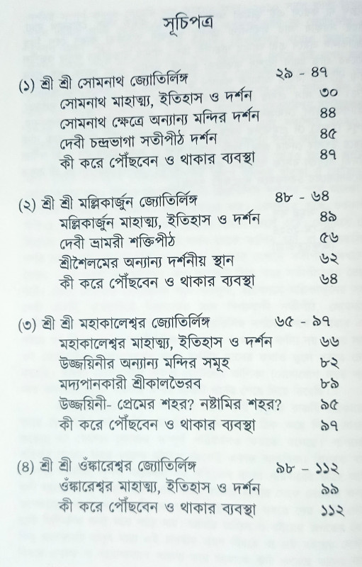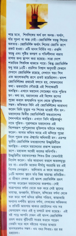 শাস্ত্র মতে, শিবলিঙ্গের অর্থ হল অনন্ত। অর্থাৎ, যাঁর সূচনা বা অন্ত নেই। জ্যোতির্লিঙ্গ স্বয়ম্ভূ শিবের অবতার। জ্যোতির্লিঙ্গ অর্থাৎ শিবের জ্যোতি রূপে প্রকট হওয়া। এটি মানব নির্মিত নয়। এগুলি স্বয়ম্ভূ এবং সৃষ্টির কল্যাণ ও গতিশীলতা বজায় রাখার জন্য স্থাপন করা হয়েছে। সারা দেশে শতাধিক শিবলিঙ্গ থাকতে পারে। কিন্তু জ্যোতির্লিঙ্গ শুধু মাত্র ১২টি। প্রচলিত বিশ্বাস অনুযায়ী যেখানে যেখানে জ্যোতির্লিঙ্গ রয়েছে, সেখানে স্বয়ং শিব এক আলোকরশ্মি রূপে প্রকট হয়েছিলেন। দ্বাদশ জ্যোতির্লিঙ্গের প্রথমেই বলতে হয়, সোমনাথের কথা। গুজরাটের সৌরাষ্ট্রে এই শিবক্ষেত্রটি অবস্থিত। এখানে মহাদেব সোমেশ্বর নামে পূজিত হন। বলা হয়, মহাদেবের এই বিশেষ রূপের পুজো করলে জন্মজনিত দুঃখ থেকে মুক্তিলাভসম্ভব। ভক্তিভরে যিনি এই জ্যোতির্লিঙ্গের আরাধনা করেন তিনি মৃত্যুর পর শিবের মধ্যেই লীন হন। মহাদেবের দ্বিতীয় জ্যোতির্লিঙ্গটি অন্ধপ্রদেশের শৈলপর্বতে অবস্থিত। এখানে তিনি মল্লিকার্জুন নামে পূজিত। পুরাণমতে মহাদেবের এই বিশেষরূপ পূর্বপুরুষের মুক্তিলাভ ঘটাতে সাহায্য করেন। আবার কথিত আছে এই মন্দিরে পুজো দিলে পূজক রাজ ঐশ্বর্যের অধিকারী হন। এরপর তৃতীয় জ্যোতির্লিঙ্গ মধ্যপ্রদেশের উজ্জয়িনীতে অবস্থিত। এখানে মহাদেবের প্রকাশ মহাকাল রূপে। মহাকাল অর্থেই কালের অধিপতি। উজ্জয়িনীর মহাকালেশ্বর শিবও ঠিক তেমনটাই নির্দেশ করেন। তাঁর আরাধনা করলে অকালমৃত্যু হয় না। এমনকি ভক্তের দীর্ঘায়ু বরপ্রাপ্তি হয় এই বিশেষ দেবস্থলে। তালিকায় এ ভাবে ভারতের ১২টি আলাদা স্থানে তাঁর ভিন্ন মাহাত্ম্য প্রতিষ্ঠিত। এ জীবনে লেখক এই দ্বাদশ জ্যোতির্লিঙ্গ ভ্রমণ সম্পন্ন করেছেন মহাদেবের করুণায়। সেই যাত্রাপথের বর্ণনা থেকে শুরু করে সেই স্থানের মাহাত্ম্য, জনশ্রুতি, ইতিহাস, মন্দিরের বর্ণনা থেকে শুরু করে পার্শ মন্দির গুলির পরিচয়, কাছাকাছি অন্যান্য দর্শনীয় স্থানের বর্ণনা, লেখকের অভিজ্ঞতা ও প্রতিটি জায়গায় থাকার হোটেলের নাম সহ যোগাযোগ নম্বর এই দু মলাটে রাখা হয়েছে। এই বই পড়ে আপনি যেমন এই দ্বাদশ জ্যোতির্লিঙ্গ ভ্রমণ করার খুঁটিনাটি সংগ্রহ করতে পারেন তেমনি ঘরে বসে বইয়ের পাতার মাধ্যমে মানসভ্রমণও সম্ভব। ওম নমঃ শিবায়। হর হর মহাদেব।