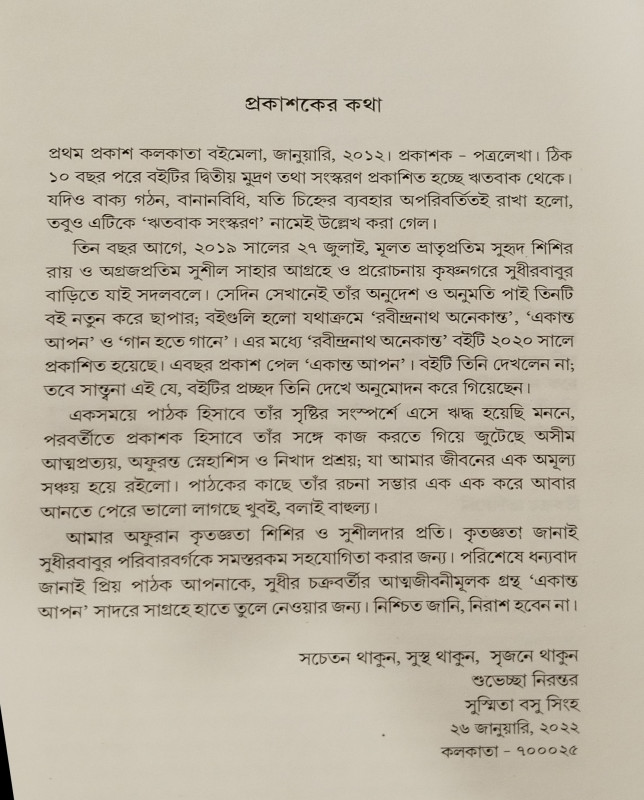 তিন বছর আগে, ২০১৯ সালের ২৭ জুলাই, মূলত ভ্রাতৃপ্রতিম সুহৃদ শিশির রায় ও অগ্রজপ্রতিম সুশীল সাহার আগ্রহে ও প্ররোচনায় কৃষ্ণনগরে সুধীরবাবুর বাড়িতে যাই সদলবলে। সেদিন সেখানেই তাঁর অনুদেশ ও অনুমতি পাই তিনটি বই নতুন করে ছাপার; বইগুলি হলো যথাক্রমে 'রবীন্দ্রনাথ অনেকান্ত', 'একান্ত আপন' ও 'গান হতে গানে'। এর মধ্যে 'রবীন্দ্রনাথ অনেকান্ত' বইটি ২০২০ সালে প্রকাশিত হয়েছে। এবছর প্রকাশ পেল 'একান্ত আপন'। বইটি তিনি দেখলেন না; তবে সান্ত্বনা এই যে, বইটির প্রচ্ছদ তিনি দেখে অনুমোদন করে গিয়েছেন।
