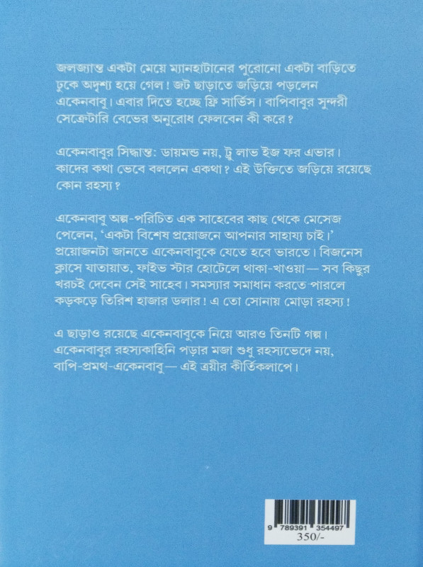 এ ছাড়াও রয়েছে একেনবাবুকে নিয়ে আরও তিনটি গল্প। একেনবাবুর রহস্যকাহিনি পড়ার মজা শুধু রহস্যভেদে নয়, বাপি-প্রমথ-একেনবাবু--- এই ত্রয়ীর কীর্তিকলাপে।