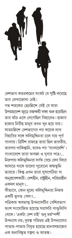 দেশভাগ কতরকমের সংকট যে সৃষ্টি করেছে তার লেখাজোখা নেই। গত শতকের ছেচল্লিশে সেই যে সারা উপমহাদেশ জুড়ে রক্তক্ষয়ী দাঙ্গা শুরু হয়েছিল তার আঁচ এসে লেগেছিল বিহারেও। হাজার হাজার নিরীহ মানুষ তখন খুন হয়ে যায়। সাতচল্লিশে দেশভাগের পর কয়েক লাখ বিহারির সঙ্গে কলিমুদ্দিনরা চলে যায় পূর্ব বাংলায়। ব্রিটিশ রাজত্বে তারা ছিল ভারতীয়, তারপর পাকিস্তানি, তারও পর ‘বাংলাদেশি’। বাংলাদেশে তারা অবজ্ঞা ও ঘৃণার পাত্র!… নিরুপায় কলিমুদ্দিনরা সর্বস্ব বেচে ফের ফিরে আসতে থাকে তাদের পুরোনো জন্মভূমি ভারতে। কিন্তু এখন তারা ঘুসপেঠিয়া বা অনুপ্রবেশকারী। দেশহীন, রাষ্ট্রহীন, পরিচয়হীন একদল মানুষ।…