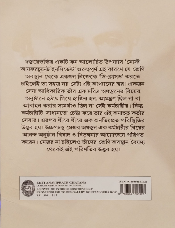 দস্তয়েভস্কির একটি কম আলোচিত উপন্যাস 'মোস্ট আনফরচুনেট ইনসিডেন্ট' গুরুত্বপূর্ণ এই কারণে যে শ্রেণি অবস্থান থেকে একজন নিজেকে 'ডি-ক্লাসড' করতে চাইলেই তা সহজ নয় সেটা এই আখ্যানের স্বর। একজন সেনা আধিকারিক তাঁর এক দরিদ্র অধস্তনের বিয়ের অনুষ্ঠানে হঠাৎ গিয়ে হাজির হন, আমন্ত্রণ ছিল না বা আবাহন করার সামর্থ্যও ছিল না সেই কর্মচারীর। কিন্তু কর্মচারীটি সাধ্যমতো চেষ্টা করে তার এই অনাহুত কর্তার সেবার। এরপর ধীরে ধীরে এক অনভিপ্রেত পরিস্থিতির উদ্ভব হয়। উচ্চপদস্থ মেজর অধস্তন এক কর্মচারীর বিয়ের আনন্দ অনুষ্ঠান বিষাদ ও বিড়ম্বনার আয়োজনে পরিণত করেন। মেজর না চাইলেও তাঁদের শ্রেণি অবস্থান বৈষম্য থেকেই এই পরিণতির উদ্ভব হয়।