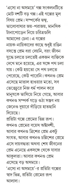‘এসো না অসময়ে’ গল্প সংকলনটিতে মোট দশটি বড় গল্প। এই গল্পের মূল বিষয় প্রেম। সম্পর্কের দ্বন্দ্ব, ভালোবাসার জয়-পরাজয়, মানসিক টানাপোড়েন নিয়ে চরিত্রগুলি আমাদের চেনা। এ গল্পের নায়ক-নায়িকাদের কাছে শুধুই রঙিন বসন্তে প্রেম ধরা দেয়নি, বরং জীবন যুদ্ধে চলতে চলতেই একজন ব্যক্তিকে দেখে মনে হয়েছে, এর সঙ্গে পথ চলা যায়।