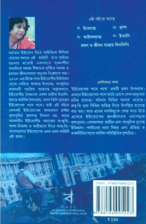 বর্তমান ইউরোপ নিয়ে সাহিত্যিক দীপিকা ঘোষের কলমে এই কাহিনী তাঁর সাহিত্য রচনার মতোই একাধারে সৃজনশীল অন্যদিকে সমাজ বীক্ষনের দৃষ্টিতে সমাজ ও চলমান জীবনধারার অনুপম বিশ্লেষণে ঋদ্ধ। ১৯১৮-এর গ্রীষ্মে যখন ইউরোপীয় ইউনিয়ন থেকে বেরিয়ে আসছে ইংল্যান্ড, সংস্কৃতির রাজধানী প্যারিস আক্রান্ত সন্ত্রাসবাদে, ইউরোপীয় বৈভবের একদা প্রতীক ইতালি-ধুঁকছে আর্থিক দৈন্যতায়, তখন তিনি ঘুরছেন ইউরোপের পথে পথে। তাই এই বইয়ে কেবলই ইউরোপের অসাধারণ দ্রষ্টব্য স্থানগুলির প্রাণবন্ত বিবরণ নয়, আছে সমকালীন ইউরোপীয় সমাজের সংস্কৃতি, আশা-নিরাশা ও অতীতকে ফিরে আকুতি। বাংলাভাষায় ইউরোপের এমন ভ্রমণ কাহিনী এই প্রথম।