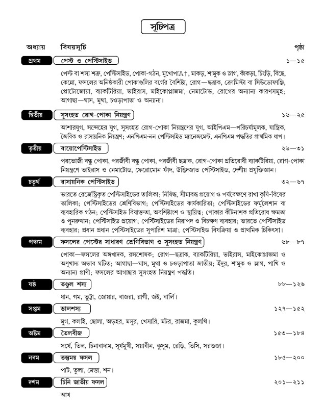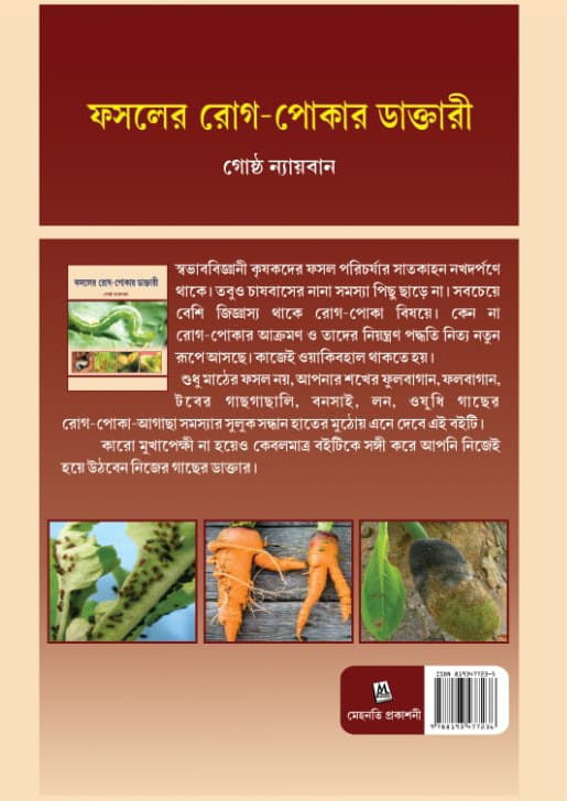 শুধু মাঠের ফসল নয়, আপনার শখের ফুলবাগান, ফলবাগান, টবের গাছগাছালি, বনসাই, লন, ওষুধি গাছের রোগ-পোকা-আগাছা সমস্যার সুলুক সন্ধান হাতের মুঠোয় এনে দেবে এই বইটি। কারো মুখাপেক্ষী না হয়েও কেবলমাত্র বইটিকে সঙ্গী করে আপনি নিজেই হয়ে উঠবেন নিজের গাছের ডাক্তার।