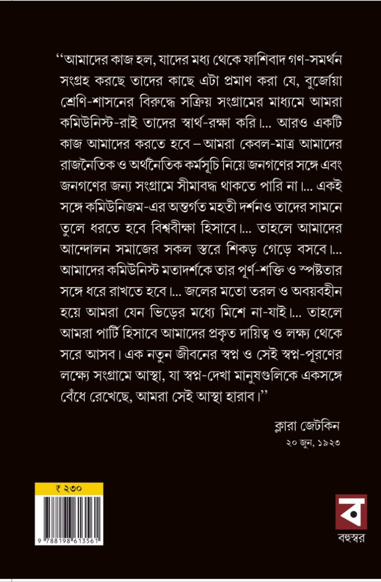 "আমাদের কাজ হল, যাদের মধ্য থেকে ফাশিবাদ গণ-সমর্থন সংগ্রহ করছে তাদের কাছে এটা প্রমাণ করা যে, বুর্জোয়া শ্রেণি-শাসনের বিরুদ্ধে সক্রিয় সংগ্রামের মাধ্যমে আমরা কমিউনিস্ট-রাই তাদের স্বার্থ-রক্ষা করি।... আরও একটি কাজ আমাদের করতে হবে- আমরা কেবল-মাত্র আমাদের রাজনৈতিক ও অর্থনৈতিক কর্মসূচি নিয়ে জনগণের সঙ্গে এবং জনগণের জন্য সংগ্রামে সীমাবদ্ধ থাকতে পারি না।... একই সঙ্গে কমিউনিজম-এর অন্তর্গত মহতী দর্শনও তাদের সামনে তুলে ধরতে হবে বিশ্ববীক্ষা হিসাবে।... তাহলে আমাদের আন্দোলন সমাজের সকল স্তরে শিকড় গেড়ে বসবে।... আমাদের কমিউনিস্ট মতাদর্শকে তার পূর্ণ-শক্তি ও স্পষ্টতার সঙ্গে ধরে রাখতে হবে।... জলের মতো তরল ও অবয়বহীন হয়ে আমরা যেন ভিড়ের মধ্যে মিশে না-যাই।... তাহলে আমরা পার্টি হিসাবে আমাদের প্রকৃত দায়িত্ব ও লক্ষ্য থেকে সরে আসব। এক নতুন জীবনের স্বপ্ন ও সেই স্বপ্ন-পূরণের লক্ষ্যে সংগ্রামে আস্থা, যা স্বপ্ন-দেখা মানুষগুলিকে একসঙ্গে বেঁধে রেখেছে, আমরা সেই আস্থা হারাব।”
