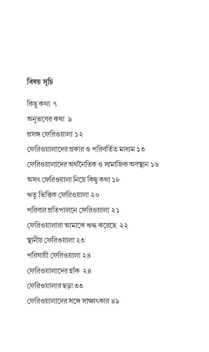 ফেরিওয়ালাদের নিয়ে আমাদের আগ্রহ থাকলেও তাদের সম্পর্কে বিশদ ধারনা নেই। সেকালের ফেরিওয়ালা থেকে আধুনিক ফেরিওয়ালাদের জীবনচরিত, ব্যবসা বিনিময় ইত্যাদি এই গ্রন্থে আলোচনা করেছেন লেখক।