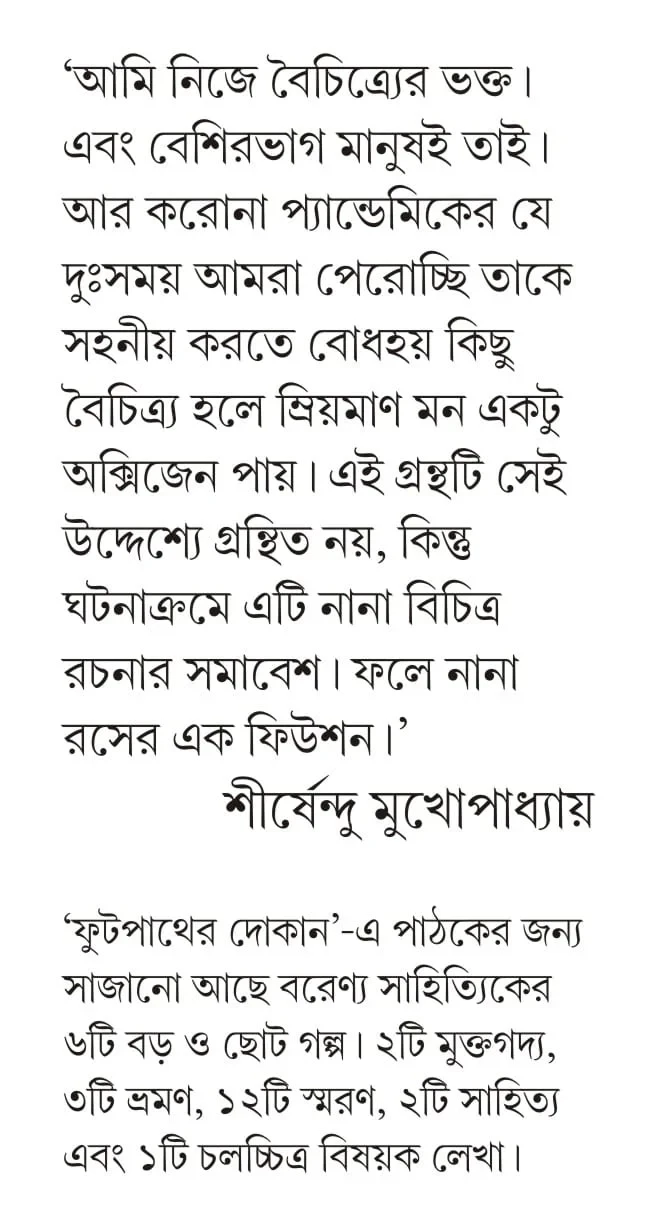 ‘ফুটপাথের দোকান’-এ পাঠকের জন্য সাজানো আছে বরেণ্য সাহিত্যিকের ৬টি বড় ও ছোট গল্প৷ ২টি মুক্তগদ্য, ৩টি ভ্রমণ, ১২টি স্মরণ, ২টি সাহিত্য এবং ১টি চলচ্চিত্র বিষয়ক লেখা ৷