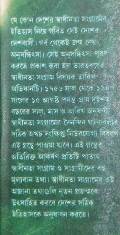 যে কোন দেশের স্বাধীনতা সংগ্রামের ইতিহাস নিয়ে গর্বিত সেই দেশের দেশবাসী। গর্ব থেকেই জন্মা নেয় অনুসন্ধিৎসা। সেই অনুসন্ধিৎসা পরণ করতে প্রকাশ করা হল ভারতবর্ষের স্বাধীনতা সংগ্রাম বিষয়ক তারিখ অভিধানটি। ১৭৫৬ সাল থেকে ১৯৪৭ সালের ১৫ আগষ্ট পর্যন্ত প্রায় দুইশত বছরের সাল, মাস ও তারিখ অনফয়ী স্বাধীনতা সংগ্রামের দৈনন্দিন ঘটনাবলীর সঠিক অথচ সংক্ষিপ্ত নির্ভরযোগ্য বিবরণী এই গ্রন্থে পাওয়া যাবে। এই গ্রন্থের অতিরিক্ত আকর্ষণ প্রতিটি পাতায় স্বাধীনতা সংগ্রাম ও সংগ্রামীদের বহু মূল্যবান তথ্য। স্বাধীনতা সংগ্রামের এই অজানা তথ্যগুলি নূতন প্রজন্মকে উৎসাহিত করবে দেশের সঠিক ইতিহাসকে অনুধাবন করতে।