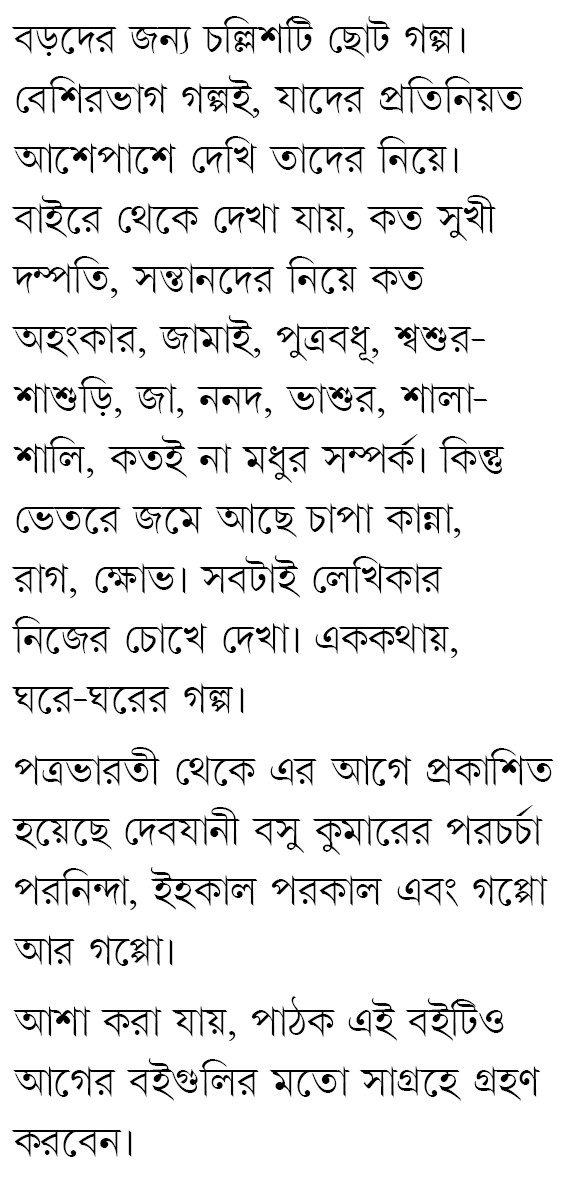 পত্রভারতী থেকে এর আগে প্রকাশিত হয়েছে দেবযানী বসু কুমারের পরচর্চা পরনিন্দা, ইহকাল পরকাল এবং গপ্পো আর গপ্পো।