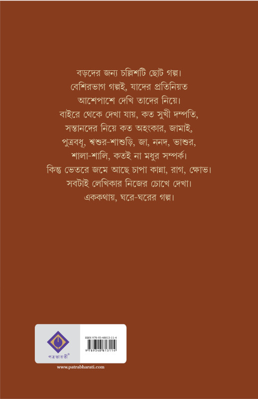 বড়দের জন্য চল্লিশটি ছোট গল্প। বেশিরভাগ গল্পই, যাদের প্রতিনিয়ত আশেপাশে দেখি তাদের নিয়ে। বাইরে থেকে দেখা যায়, কত সুখী দম্পতি, সন্তানদের নিয়ে কত অহংকার, জামাই, পুত্রবধূ, শ্বশুর-শাশুড়ি, জা, ননদ, ভাশুর, শালা-শালি, কতই না মধুর সম্পর্ক। কিন্তু ভেতরে জমে আছে চাপা কান্না, রাগ, ক্ষোভ। সবটাই লেখিকার নিজের চোখে দেখা। এককথায়, ঘরে-ঘরের গল্প।