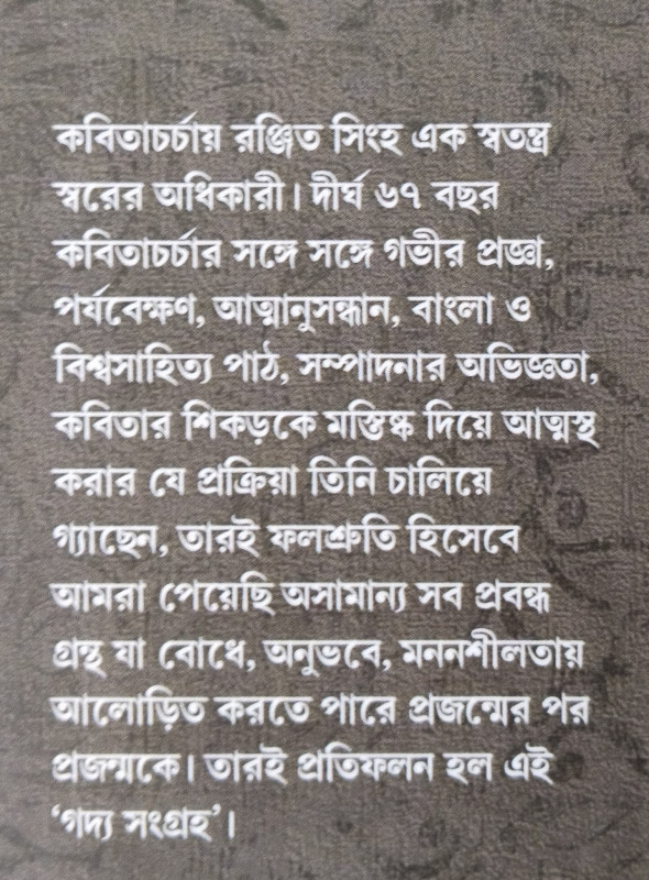 কবিতাচর্চায় রঞ্জিত সিংহ এক স্বতন্ত্র স্বরের অধিকারী। দীর্ঘ ৬৭ বছর কবিতাচর্চার সঙ্গে সঙ্গে গভীর প্রজ্ঞা, পর্যবেক্ষণ, আত্মানুসন্ধান, বাংলা ও বিশ্বসাহিত্য পাঠ, সম্পাদনার অভিজ্ঞতা, কবিতার শিকড়কে মস্তিষ্ক দিয়ে আত্মস্থ করার যে প্রক্রিয়া তিনি চালিয়ে গ্যাছেন, তারই ফলশ্রুতি হিসেবে আমরা পেয়েছি অসামান্য সব প্রবন্ধ গ্রন্থ যা বোধে, অনুভবে, মননশীলতায় আলোড়িত করতে পারে প্রজন্মের পর প্রজন্মকে। তারই প্রতিফলন হল এই 'গদ্য সংগ্রহ'।