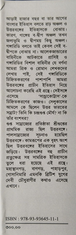 আড়াই হাজার বছর বা তার আগের বাংলার ইতিহাস বলতে রাঢ় অঞ্চল ও উত্তরবঙ্গের ইতিহাসকে বোঝায়। কারণ, গাঙ্গেয় ব-দ্বীপ অঞ্চল তখন জলাভূমি ও দ্বীপময় কিছু অঞ্চল। গঙ্গারিডি বলতে তাই কেবল সেই ব-দ্বীপকে বোঝায় না। আলেকজান্ডারের বাহিনীকে আটকাতে প্রাসিই ও গঙ্গারিডির বিশাল বাহিনীর যে বর্ণনা আমরা গ্রিক ও রোমান লেখকদের লেখায় পাই, সেই গঙ্গারিডিকে চিহ্নিতকরণের পাশাপাশি আমরা উত্তরবঙ্গের প্রাচীন ইতিহাস নিয়ে আলোচনা করেছি এই গ্রন্থে। সেইসঙ্গে এসেছে ‘সান্ড্রাকোট্টাস’-কে চিহ্নিতকরণের কাজও। সেলুকাসের আমলে কে ছিলেন উত্তর ভারতের সম্রাট? তিনি কি চন্দ্রগুপ্ত মৌর্য? না কি তাঁর বংশধর?