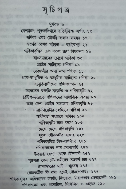 সমাজের সব শ্রেণির যৌনকর্মীদের নিয়ে গবেষণামূলক আলোচনা। তুলে আনার চেষ্টা করা হয়েছে গোটা বিশ্বের বিভিন্ন দেশের গণিকাবৃত্তির ইতিহাস ও বর্তমান বহমানতা। যৌনপেশা কারা করে? কেন করে? কারা যায় যৌনকর্মীর কাছে? কেন যায়? যৌনকর্ম কি বৈধ করা উচিত? কেন উচিত? কেন অনুচিত? যৌনকর্মীদের অন্দরমহলের কথা উঠে এসেছে। উঠে এসেছে তাঁদের জীবন-যৌবন-অর্থের কথাও। চমকে যাওয়ার মতো অনেক তথ্য উঠেছে, যা আগে কখনো কেউ বলেনি। উঠে এসেছে পুরুষ যৌনকর্মীদের কথাও। এই গ্রন্থ কেবলমাত্র তথ্যের ঘনঘটা নয়, এটি একটি ওয়ার্কশপ। মাঠে নেমে সংশ্লিষ্ট মানুষের সঙ্গে কথা বলে তুলে আনা হয়েছে মানুষের কথাই। সর্বোপরি এটা বলে রাখা প্রয়োজন, এই গ্রন্থটি শুধুমাত্র প্রাপ্তমনস্কদের জন্য পাঠযোগ্য কারণ এই গ্রন্থে এমন অনেক বর্ণনা আছে, এমন অনেক বিষয় আলোচিত হয়েছে, যা কখনওই অপ্রাপ্তমনস্কদের পাঠ্য নয়।