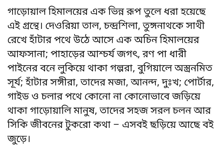 গাড়োয়াল হিমালয়ের এক ভিন্ন রূপ তুলে ধরা হয়েছে এই গ্রন্থে। দেওরিয়া তাল, চন্দ্রশিলা, তুঙ্গনাথকে সাথী রেখে হাঁটার পথে উঠে আসে এক অচিন হিমালয়ের আফসানা; পাহাড়ের আশ্চর্য জগৎ, রণ পা ধারী পাইনের বনে লুকিয়ে থাকা গল্পরা, বুগিয়ালে অস্ত্রনমিত সূর্য; হাঁটার সঙ্গীরা, তাদের মজা, আনন্দ, দুঃখ; পোর্টার, গাইড ও চলার পথে কোনো না কোনোভাবে জড়িয়ে থাকা গাড়োয়ালি মানুষ, তাদের সহজ সরল চলন আর সিকি জীবনের টুকরো কথা – এসবই ছড়িয়ে আছে বই জুড়ে।