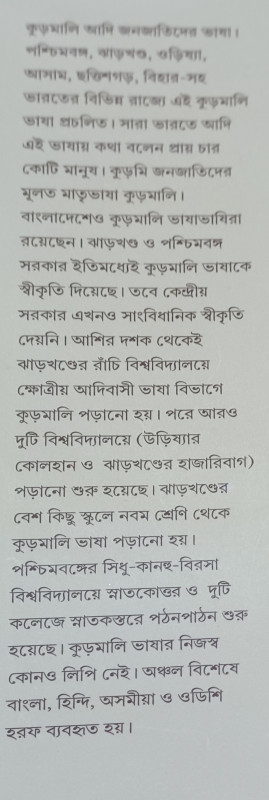 বাংলাদেশেও কুড়মালি ভাষাভাষিরা রয়েছেন। ঝাড়খণ্ড ও পশ্চিমবঙ্গ সরকার ইতিমধ্যেই কুড়মালি ভাষাকে স্বীকৃতি দিয়েছে। তবে কেন্দ্রীয় সরকার এখনও সাংবিধানিক স্বীকৃতি দেয়নি। আশির দশক থেকেই ঝাড়খণ্ডের রাঁচি বিশ্ববিদ্যালয়ে ক্ষোত্রীয় আদিবাসী ভাষা বিভাগে কুড়মালি পড়ানো হয়। পরে আরও দুটি বিশ্ববিদ্যালয়ে (উড়িষ্যার কোলহান ও ঝাড়খণ্ডের হাজারিবাগ) পড়ানো শুরু হয়েছে। ঝাড়খণ্ডের বেশ কিছু স্কুলে নবম শ্রেণি থেকে কুড়মালি ভাষা পড়ানো হয়। পশ্চিমবঙ্গের সিধু-কানহু-বিরসা বিশ্ববিদ্যালয়ে স্নাতকোত্তর ও দুটি কলেজে স্নাতকস্তরে পঠনপাঠন শুরু হয়েছে। কুড়মালি ভাষার নিজস্ব কোনও লিপি নেই। অঞ্চল বিশেষে বাংলা, হিন্দি, অসমীয়া ও ওডিশি হরফ ব্যবহৃত হয়।