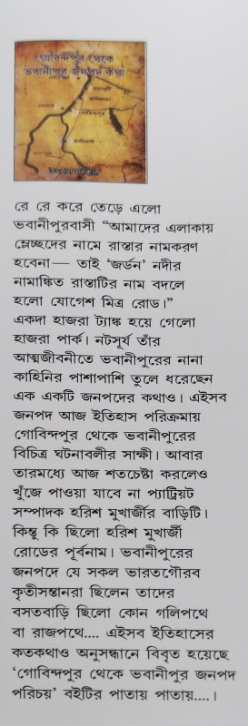 রে রে করে তেড়ে এলো ভবানীপুরবাসী "আমাদের এলাকায় ম্লেচ্ছদের নামে রাস্তার নামকরণ হবেনা- তাই 'জর্ডন' নদীর নামাঙ্কিত রাস্তাটির নাম বদলে হলো যোগেশ মিত্র রোড।" একদা হাজরা ট্যাঙ্ক হয়ে গেলো হাজরা পার্ক। নটসূর্য তাঁর আত্মজীবনীতে ভবানীপুরের নানা কাহিনির পাশাপাশি তুলে ধরেছেন এক একটি জনপদের কথাও। এইসব জনপদ আজ ইতিহাস পরিক্রমায় গোবিন্দপুর থেকে ভবানীপুরের বিচিত্র ঘটনাবলীর সাক্ষী। আবার তারমধ্যে আজ শতচেষ্টা করলেও খুঁজে পাওয়া যাবে না প্যাট্রিয়ট সম্পাদক হরিশ মুখার্জীর বাড়িটি। কিন্তু কি ছিলো হরিশ মুখার্জী রোডের পূর্বনাম। ভবানীপুরের জনপদে যে সকল ভারতগৌরব কৃতীসন্তানরা ছিলেন তাদের বসতবাড়ি ছিলো কোন গলিপথে বা রাজপথে.... এইসব ইতিহাসের কতকথাও অনুসন্ধানে বিবৃত হয়েছে 'গোবিন্দপুর থেকে ভবানীপুর জনপদ পরিচয়' বইটির পাতায় পাতায়....।
