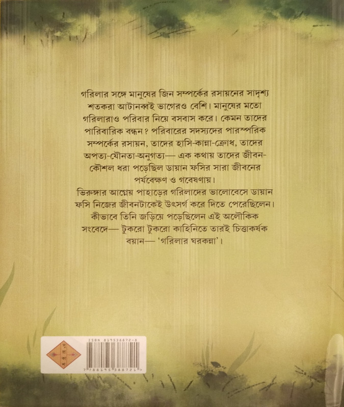 কারিসোকি গরিলা গবেষণা কেন্দ্র। গরিলাদের নিয়ে গবেষণা এবং একই সঙ্গে গরিলাদের পুনর্বাসন কেন্দ্র। সেই গবেষণা কেন্দ্রের দায়িত্বে দীর্ঘকাল ছিলেন ডায়ান ফসি। গরিলাদের স্পষ্টভাবে দেখতে গেলে দুটি মনুষ্যনেত্র বাদেও একটি তৃতীয় নয়নের প্রয়োজন হয়। তাদের ঘনিষ্ঠ সান্নিধ্যে এক যুগেরও বেশি সময় কাটানোর ফলে ডায়ান সেই তৃতীয় নয়ন অর্জন করেছিলেন। এই বই একই সঙ্গে গরিলাদের ঘরকন্না এবং ডায়ান ফসির জীবন ও স্মৃতিকথার আলেখ্য।
