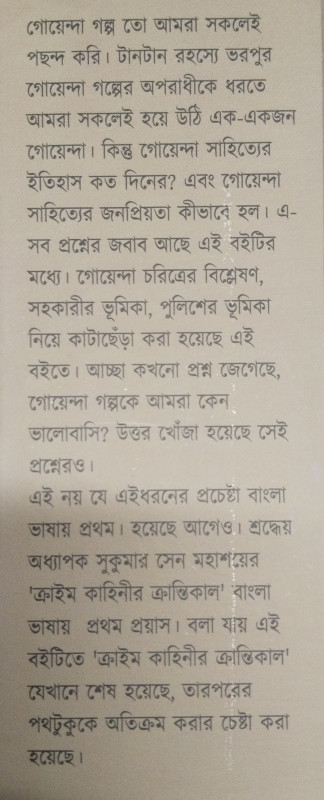 এই নয় যে এইধরনের প্রচেষ্টা বাংলা ভাষায় প্রথম। হয়েছে আগেও। শ্রদ্ধেয় অধ্যাপক সুকুমার সেন মহাশয়ের 'ক্রাইম কাহিনীর ক্রান্তিকাল' বাংলা ভাষায় প্রথম প্রয়াস। বলা যায় এই বইটিতে 'ক্রাইম কাহিনীর ক্রান্তিকাল' যেখানে শেষ হয়েছে, তারপরের পথটুকুকে অতিক্রম করার চেষ্টা করা হয়েছে।