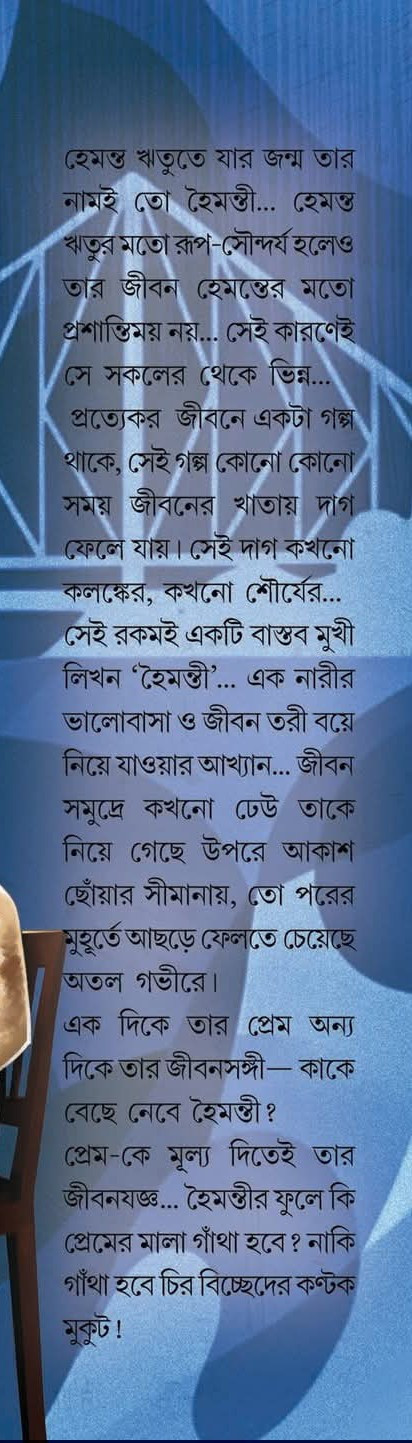 হেমন্ত ঋতুতে যার জন্ম তার নামই তো হৈমন্তী... হেমন্ত ঋতুর মতো রূপ-সৌন্দর্য হলেও তার জীবন হেমন্তের মতো প্রশান্তিময় নয়... সেই কারণেই সে সকলের থেকে ভিন্ন... প্রত্যেকর জীবনে একটা গল্প থাকে, সেই গল্প কোনো কোনো সময় জীবনের খাতায় দাগ ফেলে যায়। সেই দাগ কখনো কলঙ্কের, কখনো শৌর্যের... সেই রকমই একটি বাস্তব মুখী লিখন 'হৈমন্তী'... এক নারীর ভালোবাসা ও জীবন তরী বয়ে নিয়ে যাওয়ার আখ্যান... জীবন সমুদ্রে কখনো ঢেউ তাকে নিয়ে গেছে উপরে আকাশ ছোঁয়ার সীমানায়, তো পরের মুহূর্তে আছড়ে ফেলতে চেয়েছে অতল গভীরে।