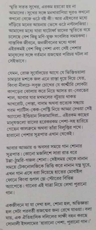 একজীবনে যা যা দেখা হল, শোনা হল, অভিজ্ঞতা হল সেটা পরবর্তী প্রজন্মের জন্য রেখে যাওয়া। বলা যায়, এক ঐতিহাসিক দলিলের সাক্ষী বহন করছে সোনালী ইসলামের ‘হারানো পেশা, পুরানো গান।’