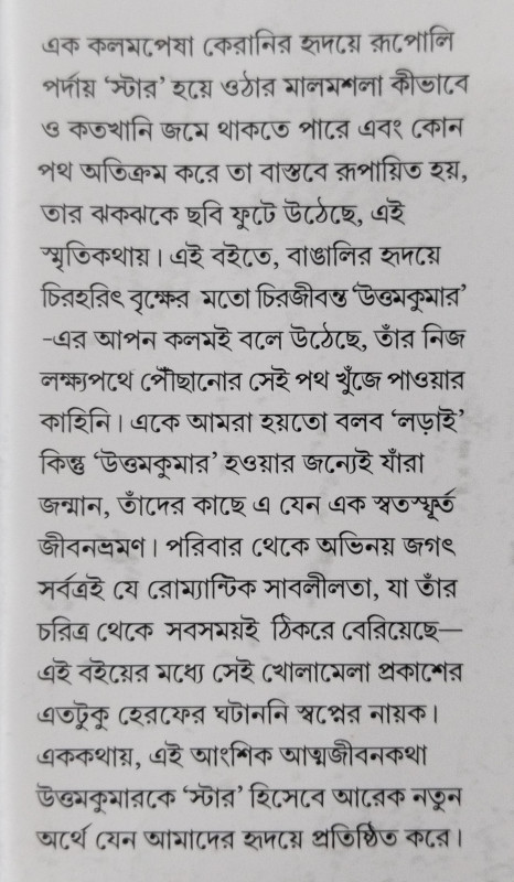 এক কলমপেষা কেরানির হৃদয়ে রূপোলি পর্দায় 'স্টার' হয়ে ওঠার মালমশলা কীভাবে ও কতখানি জমে থাকতে পারে এবং কোন পথ অতিক্রম করে তা বাস্তবে রূপায়িত হয়, তার ঝকঝকে ছবি ফুটে উঠেছে, এই স্মৃতিকথায়। এই বইতে, বাঙালির হৃদয়ে চিরহরিৎ বৃক্ষের মতো চিরজীবন্ত 'উত্তমকুমার' -এর আপন কলমই বলে উঠেছে, তাঁর নিজ লক্ষ্যপথে পৌঁছানোর সেই পথ খুঁজে পাওয়ার কাহিনি। একে আমরা হয়তো বলব 'লড়াই' কিন্তু 'উত্তমকুমার' হওয়ার জন্যেই যাঁরা জন্মান, তাঁদের কাছে এ যেন এক স্বতস্ফূর্ত জীবনভ্রমণ। পরিবার থেকে অভিনয় জগৎ সর্বত্রই যে রোম্যান্টিক সাবলীলতা, যা তাঁর চরিত্র থেকে সবসময়ই ঠিকরে বেরিয়েছে এই বইয়ের মধ্যে সেই খোলামেলা প্রকাশের এতটুকু হেরফের ঘটাননি স্বপ্নের নায়ক। এককথায়, এই আংশিক আত্মজীবনকথা উত্তমকুমারকে 'স্টার' হিসেবে আরেক নতুন অর্থে যেন আমাদের হৃদয়ে প্রতিষ্ঠিত করে।