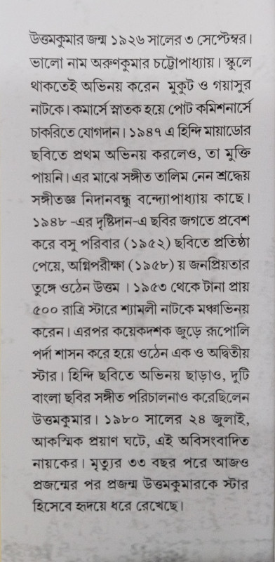উত্তমকুমার জন্ম ১৯২৬ সালের ৩ সেপ্টেম্বর। ভালো নাম অরুণকুমার চট্টোপাধ্যায়। স্কুলে থাকতেই অভিনয় করেন মুকুট ও গয়াসুর নাটকে। কমার্সে স্নাতক হয়ে পোট কমিশনার্সে চাকরিতে যোগদান। ১৯৪৭ এ হিন্দি মায়াডোর ছবিতে প্রথম অভিনয় করলেও, তা মুক্তি পায়নি। এর মাঝে সঙ্গীত তালিম নেন শ্রদ্ধেয় সঙ্গীতজ্ঞ নিদানবন্ধু বন্দ্যোপাধ্যায় কাছে। ১৯৪৮-এর দৃষ্টিদান-এ ছবির জগতে প্রবেশ করে বসু পরিবার (১৯৫২) ছবিতে প্রতিষ্ঠা পেয়ে, অগ্নিপরীক্ষা (১৯৫৮) য় জনপ্রিয়তার তুঙ্গে ওঠেন উত্তম। ১৯৫৩ থেকে টানা প্রায় ৫০০ রাত্রি স্টারে শ্যামলী নাটকে মঞ্চাভিনয় করেন। এরপর কয়েকদশক জুড়ে রূপোলি পর্দা শাসন করে হয়ে ওঠেন এক ও অদ্বিতীয় স্টার। হিন্দি ছবিতে অভিনয় ছাড়াও, দুটি বাংলা ছবির সঙ্গীত পরিচালনাও করেছিলেন উত্তমকুমার। ১৯৮০ সালের ২৪ জুলাই, আকস্মিক প্রয়াণ ঘটে, এই অবিসংবাদিত নায়কের। মৃত্যুর ৩৩ বছর পরে আজও প্রজন্মের পর প্রজন্ম উত্তমকুমারকে স্টার হিসেবে হৃদয়ে ধরে রেখেছে।