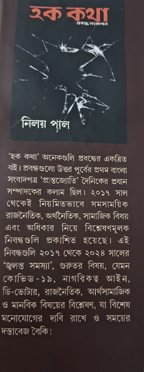 'হক কথা' অনেকগুলি প্রবন্ধের একত্রিত বই। প্রবন্ধগুলো উত্তর পূর্বের প্রথম বাংলা সংবাদপত্র 'প্রান্তজ্যোতি' দৈনিকের প্রধান সম্পাদকের কলাম ছিল। ২০১৭ সাল থেকেই নিয়মিতভাবে সমসাময়িক রাজনৈতিক, অর্থনৈতিক, সামাজিক বিষয় এবং অধিকার নিয়ে বিশ্লেষণমূলক নিবন্ধগুলি প্রকাশিত হয়েছে। এই নিবন্ধগুলি ২০১৭ থেকে ২০২৪ সালের 'জ্বলন্ত সমস্যা', গুরুতর বিষয়, যেমন কোভিড-১৯, নাগরিকত্ব আইন, ডি-ভোটার, রাজনৈতিক, আর্থসামাজিক ও মানবিক বিষয়ের বিশ্লেষণ, যা বিশেষ মনোযোগের দাবি রাখে ও সময়ের দস্তাবেজ বৈকি!