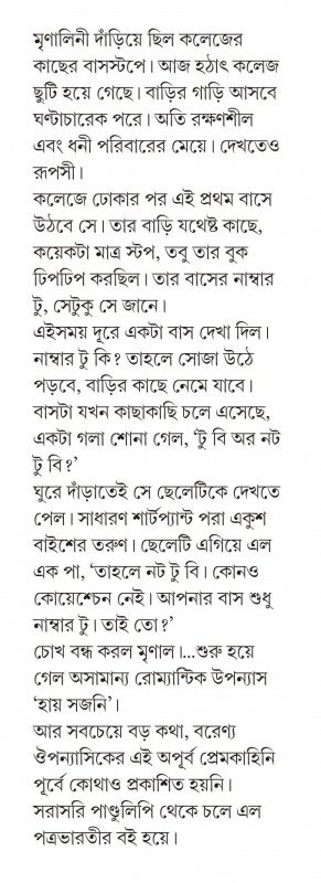 আর সবচেয়ে বড় কথা, বরেণ্য ঔপন্যাসিকের এই অপূর্ব প্রেমকাহিনি পূর্বে কোথাও প্রকাশিত হয়নি ৷ সরাসরি পাণ্ডুলিপি থেকে চলে এল পত্রভারতীর বই হয়ে ৷