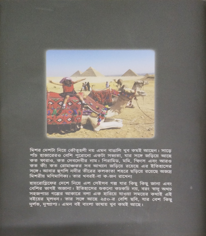 হায়রোগ্লিফের দেশে নিয়ে এল সেইসব গল্প যার কিছু কিছু জানা এবং বেশির ভাগই অজানা। ইতিহাসের শুকনো কচকচি নয়, বরং স্বাদু অথচ সহজপাচ্য গল্পের আকারে বলা এক হারিয়ে যাওয়া সময়ের কথাই এই বইয়ের মূলধন। তার সঙ্গে আছে ২৫০-র বেশি ছবি, যার বেশ কিছু দুর্লভ, দুষ্প্রাপ্য। এমন বই বাংলা ভাষায় খুব কমই আছে।