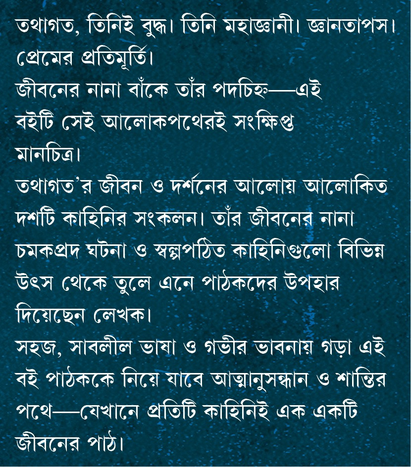তথাগত, তিনিই বুদ্ধ। তিনি মহাজ্ঞানী। জ্ঞানতাপস। প্রেমের প্রতিমূর্তি। জীবনের নানা বাঁকে তাঁর পদচিহ্ন—এই বইটি সেই আলোকপথেরই সংক্ষিপ্ত মানচিত্র। তথাগত’র জীবন ও দর্শনের আলোয় আলোকিত দশটি কাহিনির সংকলন। তাঁর জীবনের নানা চমকপ্রদ ঘটনা ও স্বল্পপঠিত কাহিনিগুলো বিভিন্ন উৎস থেকে তুলে এনে পাঠকদের উপহার দিয়েছেন লেখক। সহজ, সাবলীল ভাষা ও গভীর ভাবনায় গড়া এই বই পাঠককে নিয়ে যাবে আত্মানুসন্ধান ও শান্তির পথে—যেখানে প্রতিটি কাহিনিই এক একটি জীবনের পাঠ।