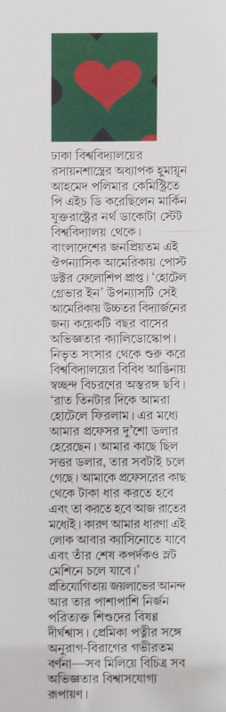 ঢাকা বিশ্ববিদ্যালয়ের রসায়নশাস্ত্রের অধ্যাপক হুমায়ূন আহমেদ পলিমার কেমিস্ট্রিতে পি এইচ ডি করেছিলেন মার্কিন যুক্তরাষ্ট্রের নর্থ ডাকোটা স্টেট বিশ্ববিদ্যালয় থেকে। বাংলাদেশের জনপ্রিয়তম এই ঔপন্যাসিক আমেরিকায় পোস্ট ডক্টর ফেলোশিপ প্রাপ্ত। 'হোটেল গ্রেভার ইন’ উপন্যাসটি সেই আমেরিকায় উচ্চতর বিদ্যার্জনের জন্য কয়েকটি বছর বাসের অভিজ্ঞতার ক্যালিডোস্কোপ। নিভৃত সংসার থেকে শুরু করে বিশ্ববিদ্যালয়ের বিবিধ আঙিনায় স্বচ্ছন্দ বিচরণের অন্তরঙ্গ ছবি। ‘রাত তিনটার দিকে আমরা হোটেলে ফিরলাম। এর মধ্যে আমার প্রফেসর দু’শো ডলার হেরেছেন। আমার কাছে ছিল সত্তর ডলার, তার সবটাই চলে গেছে। আমাকে প্রফেসরের কাছ থেকে টাকা ধার করতে হবে এবং তা করতে হবে আজ রাতের মধ্যেই। কারণ আমার ধারণা এই লোক আবার ক্যাসিনোতে যাবে এবং তার শেষ কপর্দকও স্লট মেশিনে চলে যাবে।' প্রতিযোগিতায় জয়লাভের আনন্দ আর তার পাশাপাশি নির্জন পরিত্যক্ত শিশুদের বিষণ্ণ দীর্ঘশ্বাস। প্রেমিকা পত্নীর সঙ্গে অনুরাগ-বিরাগের গভীরতম বর্ণনা—সব মিলিয়ে বিচিত্র সব অভিজ্ঞতার বিশ্বাসযোগ্য রূপায়ণ।