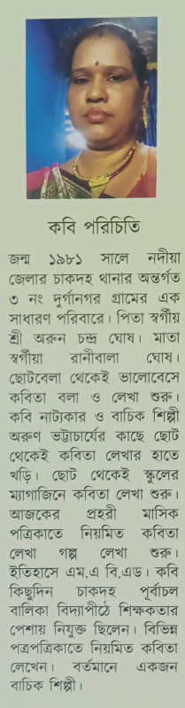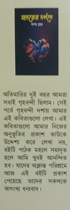 অতিমারির দুই বছর আমরা সবাই গৃহবন্দী ছিলাম। সেই পর্বে গৃহবন্দী দশায় আমার এই কবিতাগুলো লেখা। এই কবিতাগুলো আমার নিজের অনুভূতির প্রকাশ কাউকে উদ্দেশ্য করে লেখা নয়, বইটি পাঠক মহলে সমাদৃত হলে আমি খুবই আনন্দিত হব। যাদের অক্লান্ত পরিশ্রমে আজ এই বইটি প্রকাশ পেয়েছে তাদের সকলকে অসংখ্য ধন্যবাদ।