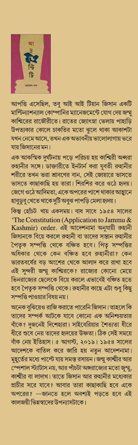 অনেক বুঝিয়েও রাজি করাতে পারেনি জিসান। তাহলে কি তাদের সম্পর্ক আটকে যাবে কোনো এক অনিশ্চয়তার বাঁকে? দুজনেই দিশেহারা। সাইবেরিয়ার শৈত্যতা ধীরে ধীরে শুষে নেয় তাদের হৃদয়ের উষ্ণতা। ঠিক সেই সময়ে বাঁক নেয় ইতিহাস। ৫ আগস্ট, ২০১৯। ১৯৫৪ সালের আদেশকে বাতিল করে জারি হয় নতুন আদেশনামা। মুহূর্তের মধ্যে পাল্টে যায় সমস্ত রসায়ন। জন্ম কাশ্মীর আর স্পেশাল স্ট্যাটাস নয়, আর পাঁচটা অঙ্গরাজ্যের মতো জুম্মু, কাশ্মীর বা লাদাখ। তাতে জিসান আর রুহানীর মধ্যেকার প্রাচীর সরে যাবে? আবার তারা কাছাকাছি হবে একে অপরের? -জানতে হলে অবশ্যই পড়তে হবে এই কালজয়ী ভিন্নস্বাদের উপন্যাসটাকে।