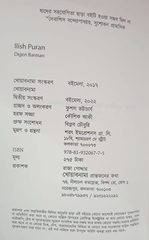 এই বইটি লেখার জন্য দু’বারে একটানা বেশ কিছুদিন মাঝসমুদ্রে ইলিশের ট্রলারে গিয়ে মাঝি-মাল্লাদের সঙ্গে থেকেছেন ক্ষেত্র সমীক্ষক-লেখক দিগেন বর্মন। কীভাবে ধরা হয় ইলিশ, কত রকমের জাল আছে ইলিশ ধরার জন্য, একটি পূর্ণাঙ্গ ইলিশের গায়ে কটি কাঁটা, মাছ ধরার পর ট্রলার থেকে মাছ আমাদের কাছে পৌঁছোনো পর্যন্ত যে বিশাল কর্মকাণ্ড; মাঝে মাঝি-মাল্লাদের যে করুণ জীবনকাহিনী— সেই বিবরণ রয়েছে এই বইতে। রয়েছে দুই বাংলার চেনা-অচেনা প্রায় ষাটটি ইলিশের পদ রান্নার কলাকৌশল।