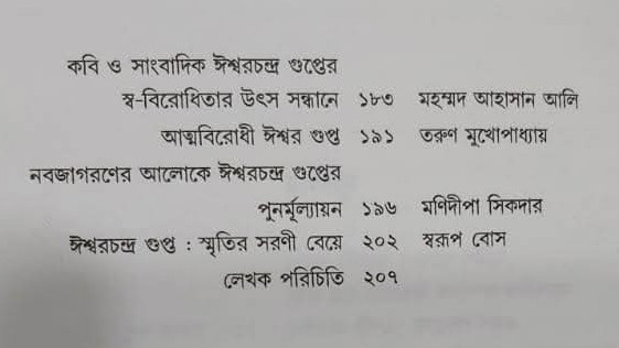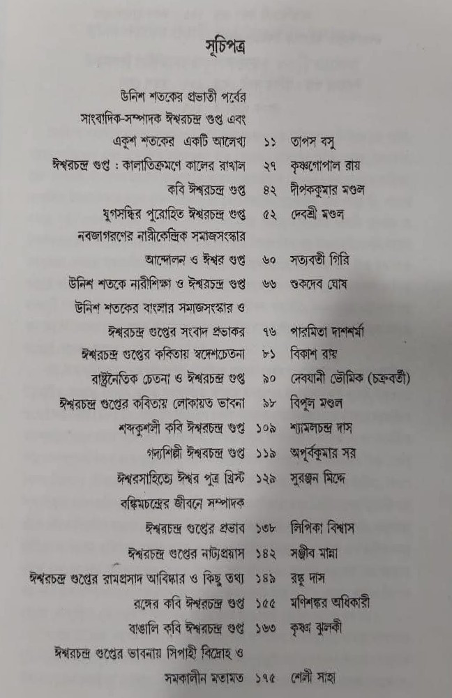 ঈশ্বরচন্দ্র গুপ্তের দ্বি-শতজন্মবার্ষিকী পেরিয়ে গেলেও যুগসন্ধিক্ষণে কবির মহিমা নিয়ে বাংলা সাহিত্যের ইতিবৃত্তে তিনি দাঁড়িয়ে আছেন। তাঁর বিচরণ কাল থেকে আজকের সময় আবহে বাংলা তথা ভারতের রাজনৈতিক-সামাজিক - অর্থনৈতিক - মনস্তাত্ত্বিক সমস্ত ক্ষেত্রে ঘটে গেছে ব্যাপক পরিবর্তন। কিন্তু তাঁর যশমহিমা যেমন ছিল প্রায় তেমনই আছে। নবীন-প্রবীণ অধ্যাপক গবেষকের মিলিত প্রয়াসে নির্বাচিত প্রবন্ধগুলিতে ঈশ্বর গুপ্তের কবি ও সাংবাদিক সত্তার প্রতি আলোকপাত করা হয়েছে, যা গুপ্তকবি সম্পর্কে আজকের পাঠককে সচেতন করবে।