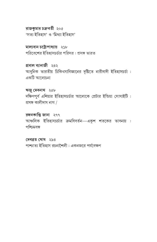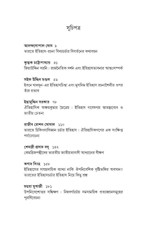ইতিহাস হল দেশ ও কালের পরিপ্রেক্ষিতে মানবসমাজের সুশৃঙ্খল কাহিনি। এটি একাধারে অংশত সাহিত্য ও অংশত বিজ্ঞান। ইতিহাস নিঃসন্দেহে সমাজবিজ্ঞানের শ্রেষ্ঠ শাখা। বিজ্ঞানের বিপুল অগ্রগতি সত্ত্বেও ইতিহাসচর্চার প্রয়োজনীয়তা ফুরিয়ে যায়নি। গ্রিকো-রোমক যুগ থেকে আজ অব্দি আড়াই হাজার বছর ধরে পৃথিবীর বিভিন্ন দেশে যত ইতিহাস লেখা হয়েছে সেসবকে ইতিহাস রচনাশৈলীর বিচারে নানা ধারা, প্রবণতা ও যুগে বিভক্ত করা যায়। ঐতিহাসিকের ইতিহাস লিখনপদ্ধতি সময় ও পরিস্থিতির পরিবর্তনের দরুন যুগে যুগে বিভিন্ন রূপ ধারণ করেছে। ভারতবর্ষ এবং পাশ্চাত্যের অতীত, মধ্য ও আধুনিক যুগে ইতিহাসচর্চার কী ধরনের বিবর্তন ঘটেছে তার নানা দিকের এক সংক্ষিপ্ত বিবরণ চোদ্দোটি নিবন্ধে এখানে উপস্থিত করা হয়েছে। ইতিহাসের ঘটনাবলি ও ব্যাখ্যাকে নিয়ে ইদানীং বহু বিতর্ক, বিভিন্ন ঐতিহাসিকের মধ্যে অনতিক্রম্য মতান্তর। ইতিহাসকে সংকীর্ণ রাজনৈতিক স্বার্থসিদ্ধির জন্য ব্যবহারের প্রবণতাও ক্রমবর্ধমান। এসবই এই পুস্তকের নানা প্রবন্ধের উপজীব্য। তবে এত সংক্ষিপ্ত পরিসরে এই বহুধাবিস্তৃত বিষয়ের সম্যক পরিচিতি তুলে ধরা এককথায় অসম্ভব। তাই এটিকে এক বিনম্র সূত্রপাত হিসেবে বিবেচনা করাই আগ্রহী পাঠকসমাজের পক্ষে সংগত হবে।