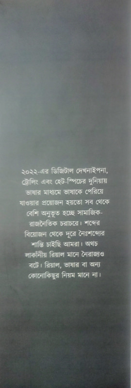 ২০২২-এর ডিজিটাল দেখনাইপনা, ট্রোলিং এবং হেট-স্পিচের দুনিয়ায় ভাষার মাধ্যমে ভাষাকে পেরিয়ে যাওয়ার প্রয়োজন হয়তো সব থেকে বেশি অনুভূত হচ্ছে সামাজিক-রাজনৈতিক চরাচরে। শব্দের বিয়োজন থেকে দূরে নৈঃশব্দ্যের শান্তি চাইছি আমরা। অথচ লাকানীয় রিয়াল মানে নৈরাজ্যও বটে। রিয়াল, ভাষার বা অন্য কোনোকিছুর নিয়ম মানে না।
