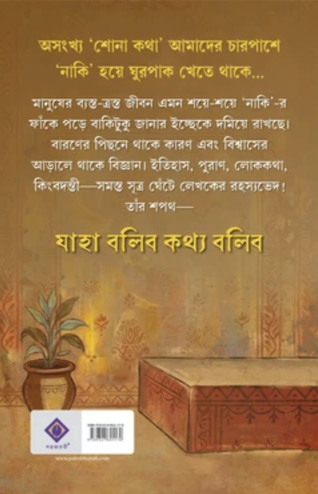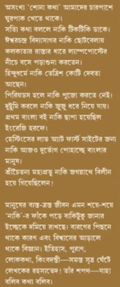 মানুষের ব্যস্ত-ত্রস্ত জীবন এমন শয়ে-শয়ে 'নাকি'-র ফাঁকে পড়ে বাকিটুকু জানার ইচ্ছেকে দমিয়ে রাখছে। বারণের পিছনে থাকে কারণ এবং বিশ্বাসের আড়ালে থাকে বিজ্ঞান। ইতিহাস, পুরাণ, লোককথা, কিংবদন্তী-সমস্ত সূত্র ঘেঁটে লেখকের রহস্যভেদ। তাঁর শপথ-যাহা বলিব কথ্য বলিব।