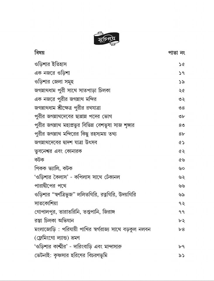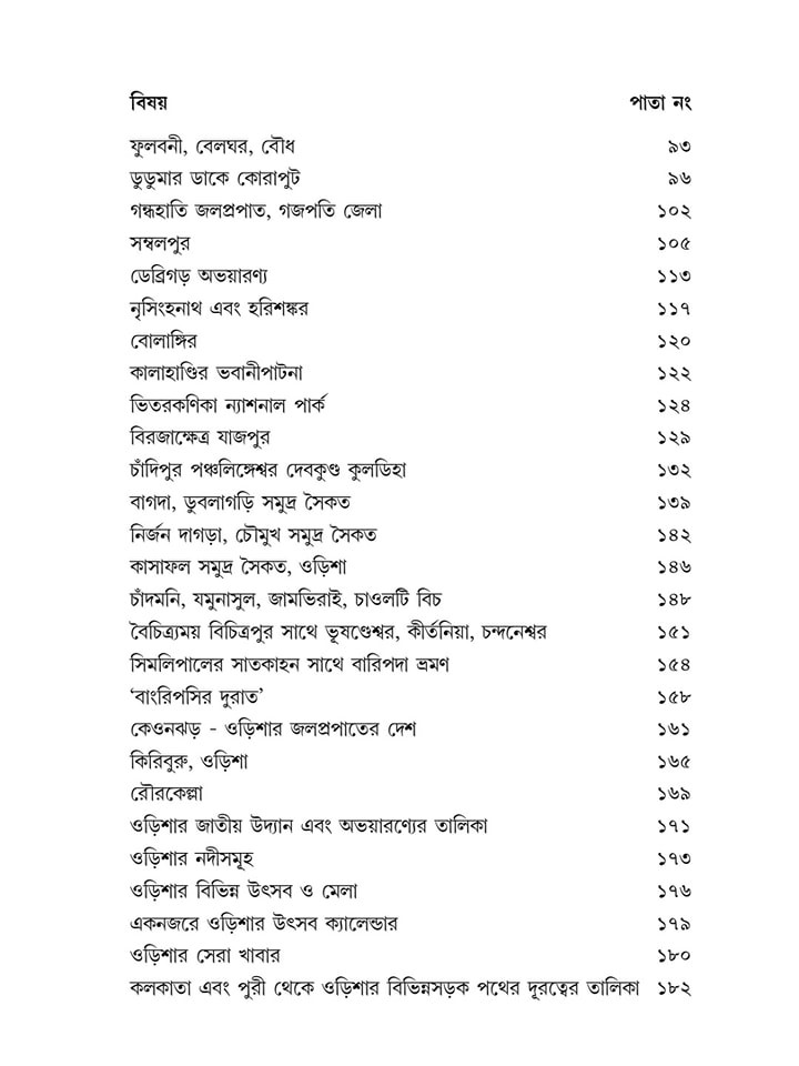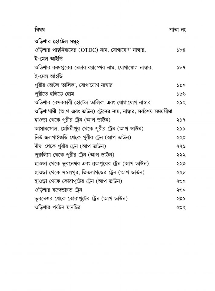হাওড়া/শালিমার/শিয়ালদহ/সাঁতরাগাছি থেকে ওড়িশার বিভিন্ন রুটের ট্রেনের নাম, নাম্বার এবং সর্বশেষ সময়সীমা সহ যাবতীয় তথ্য ছকের মাধ্যমে বইতে তুলে ধরা হয়েছে। আছে ভ্রমণ সংক্রান্ত একাধিক ম্যাপ, স্কেচ। রঙিন ছবি সহ ওড়িশার পর্যটন কেন্দ্রগুলো দু মলাটে বিশদে তুলে ধরার চেষ্টা করা হয়েছে এই বইটির মাধ্যমে।