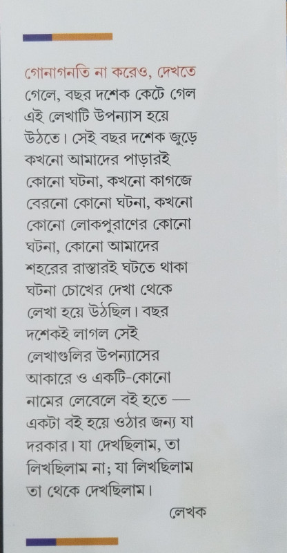 গোনাগনতি না করেও, দেখতে গেলে, বছর দশেক কেটে গেল এই লেখাটি উপন্যাস হয়ে উঠতে। সেই বছর দশেক জুড়ে কখনো আমাদের পাড়ারই কোনো ঘটনা, কখনো কাগজে বেরোনো কোনো ঘটনা, কখনো কোনো লোকপুরাণের কোনো ঘটনা, কোনো আমাদের শহরের রাস্তারই ঘটতে থাকা ঘটনা চোখের দেখা থেকে লেখা হয়ে উঠছিল। বছর দশেকই লাগল সেই লেখাগুলির উপন্যাসের আকারে ও একটি-কোনো নামের লেবেলে বই হতে- একটা বই হয়ে ওঠার জন্য যা দরকার। যা দেখছিলাম, তা লিখছিলাম না; যা লিখছিলাম তা থেকে দেখছিলাম।'-লেখক